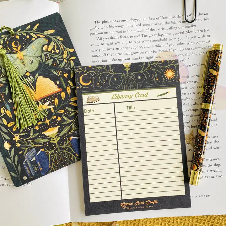 Magische Bibliothekskarte mit grüner Quaste und edlen Fantasie-Druck auf der Vorderseite und einen Lesetracker auf der Rückseite.