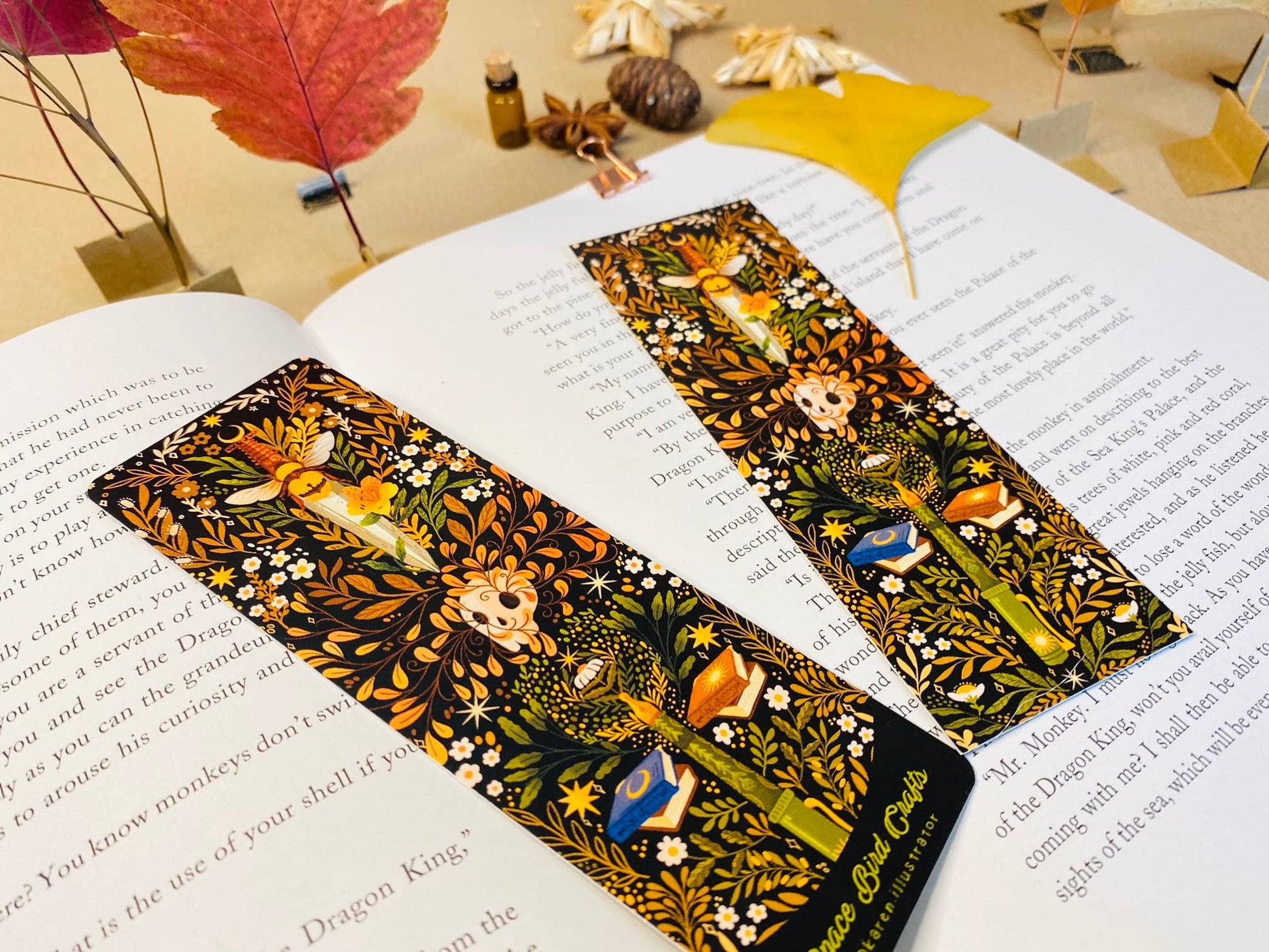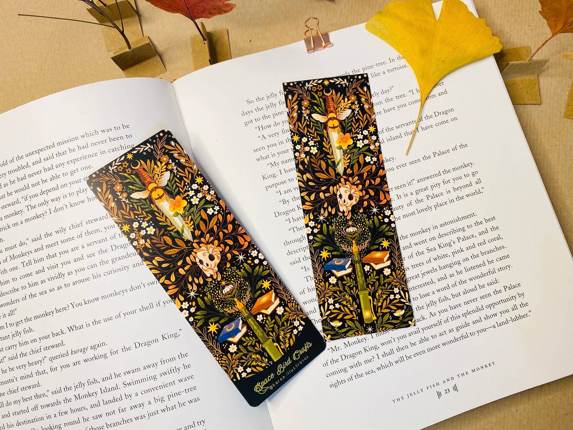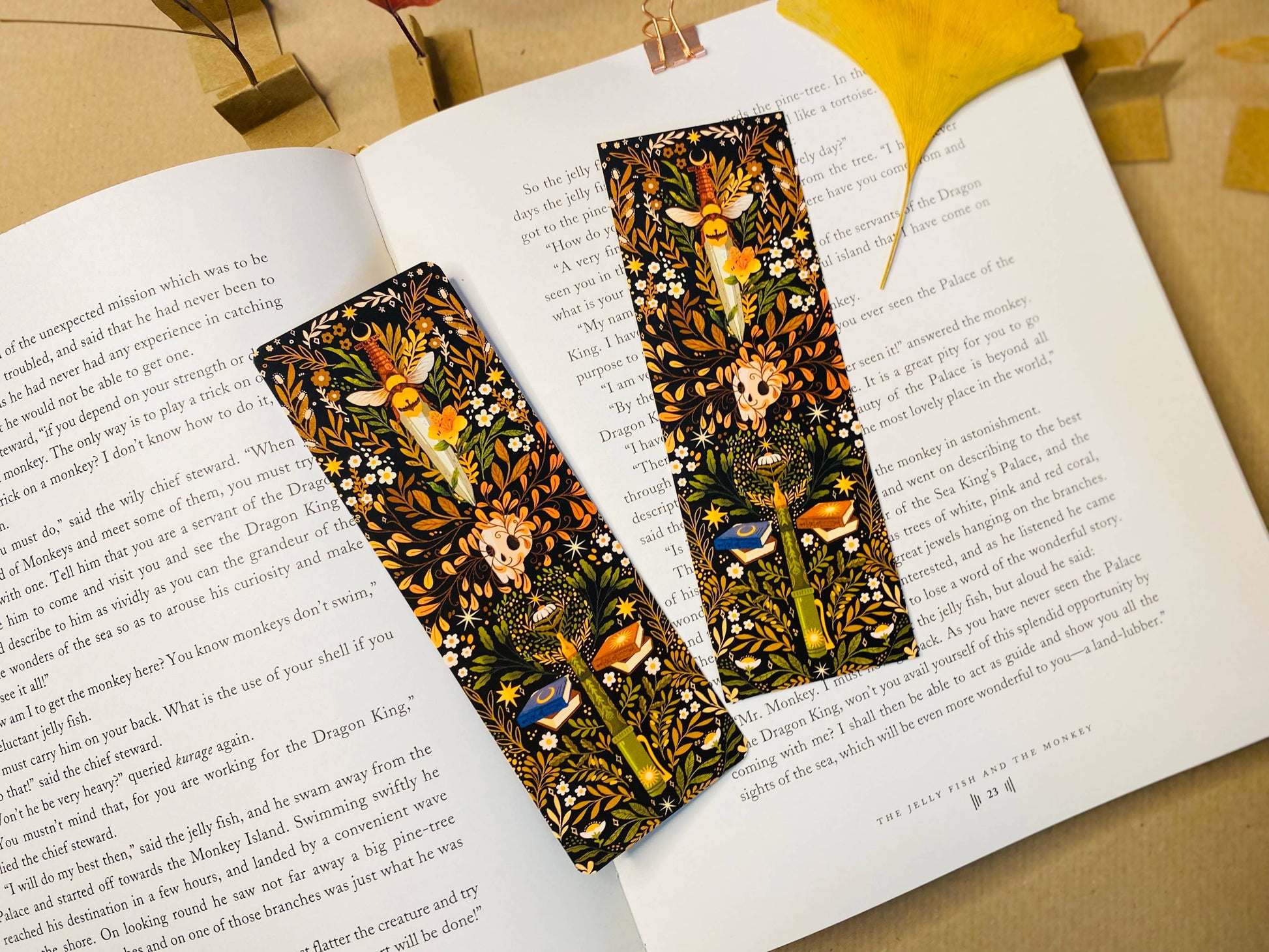 Mystisches Lesezeichen mit edlen Fantasie-Druck auf Vorder- und Rückseite.