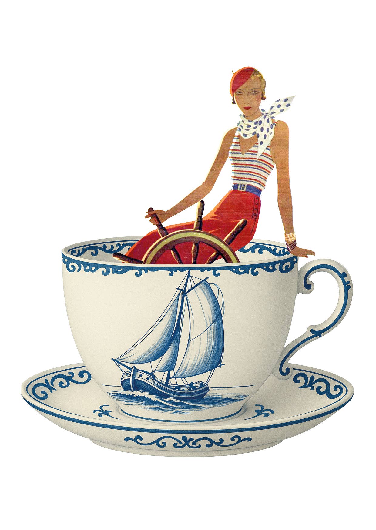 Vintage Postkarten-Collage blaues Tässchen und Frau Sail 2025.